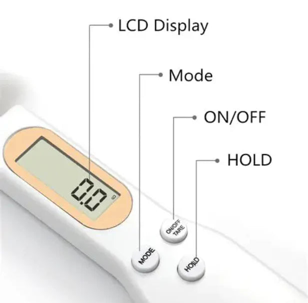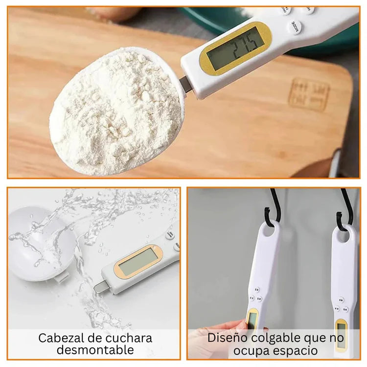 La cuchara cuenta con funciones inteligentes que facilitan su uso en la cocina: el cambio de unidades te permite alternar fácilmente entre gramos, onzas y otras medidas; la función TARA permite restar el peso del recipiente con una simple pulsación; el bloqueo de valor evita mediciones repetidas y mejora la precisión; y su manejo es muy sencillo, ya que solo necesitas mantener presionado el botón para encender, apagar o cambiar configuraciones.