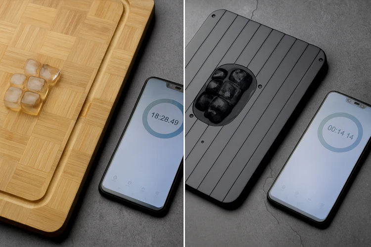 Con esta bandeja altamente eficiente de aluminio térmicamente conductor y un grosor de 6 mm, puedes descongelar carne, pescado o verduras hasta 5 veces más rápido. Gracias a su gran tamaño (8×14 pulgadas), puedes colocar varias piezas al mismo tiempo — ideal para cocinar en familia o preparar más comida de una vez, mientras su base antideslizante añade comodidad extra.