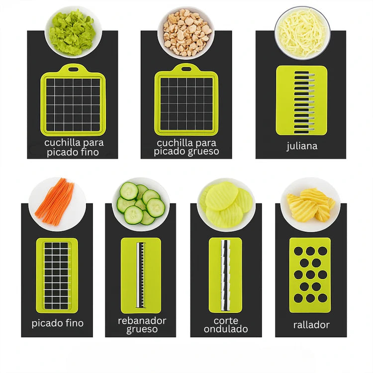 Con 7 cuchillas intercambiables para cortar, rallar y picar, este utensilio reemplaza varios aparatos de cocina. Ya sea en cubos, rodajas, juliana o cortes ondulados, solo cambias la cuchilla y listo. No es solo un cortador, es una inversión queahorra dinero,libera espacioyorganiza tu cocina.